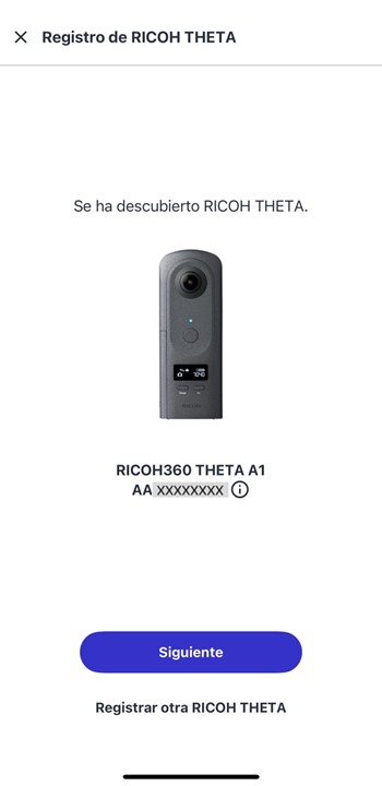 7. Cuando aparezca «Se ha descubierto RICOH THETA», toque Siguiente.