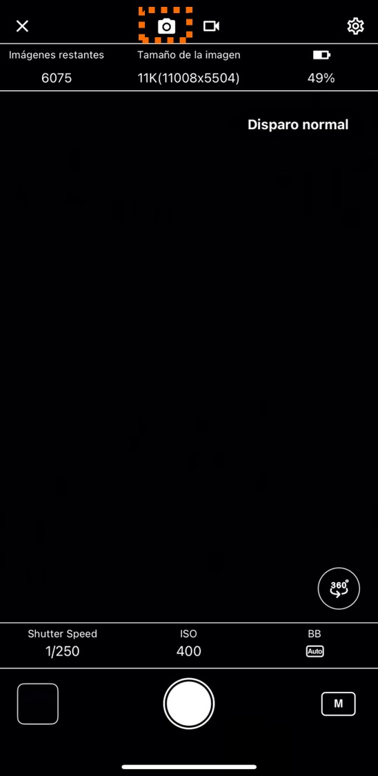 Si la cámara está en modo de captura de fotos, la aplicación mostrará también ese modo, y el símbolo de la cámara (línea discontinua verde) en la parte superior de la pantalla será reemplazado por un icono blanco relleno, como se muestra en la captura de pantalla anterior.