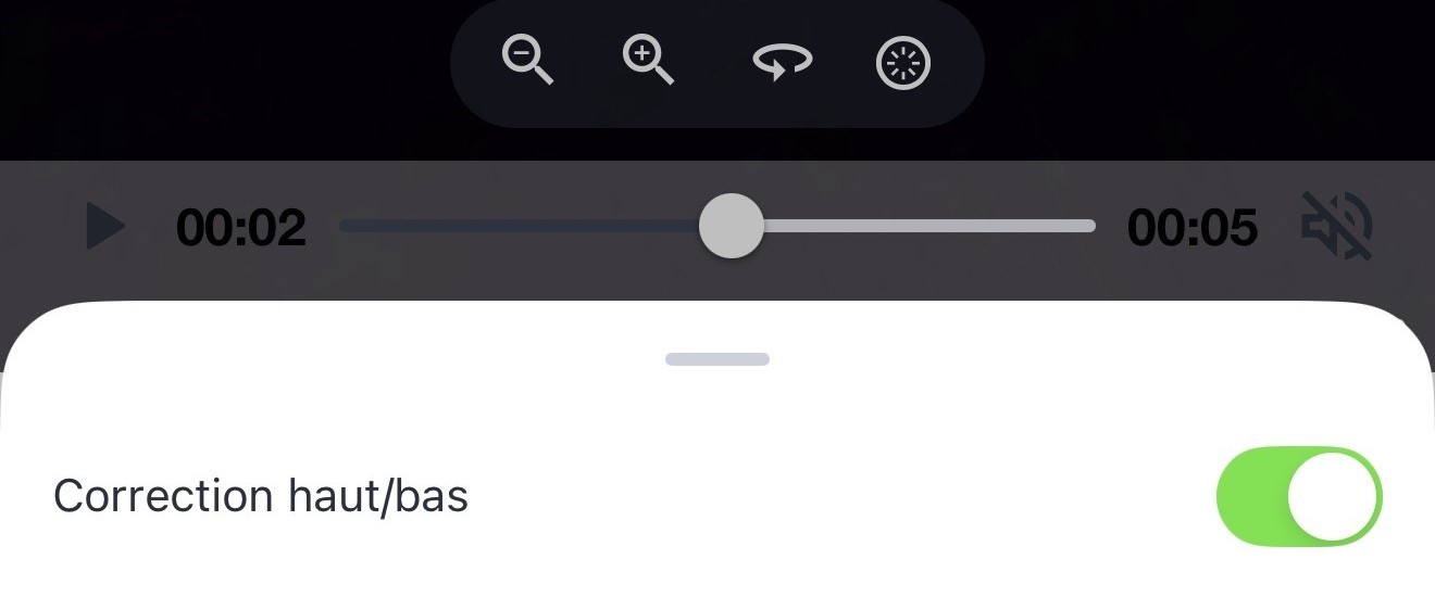 Appuyez sur le symbole ... dans le coin inférieur droit pour afficher un bouton permettant d'activer ou de désactiver la correction haut/bas pour la Vidéo en cours de lecture. Le paramètre par défaut est la correction haut/bas activée, et le paramètre activé/désactivé est appliqué à toutes les Vidéos de l'onglet Appareil.