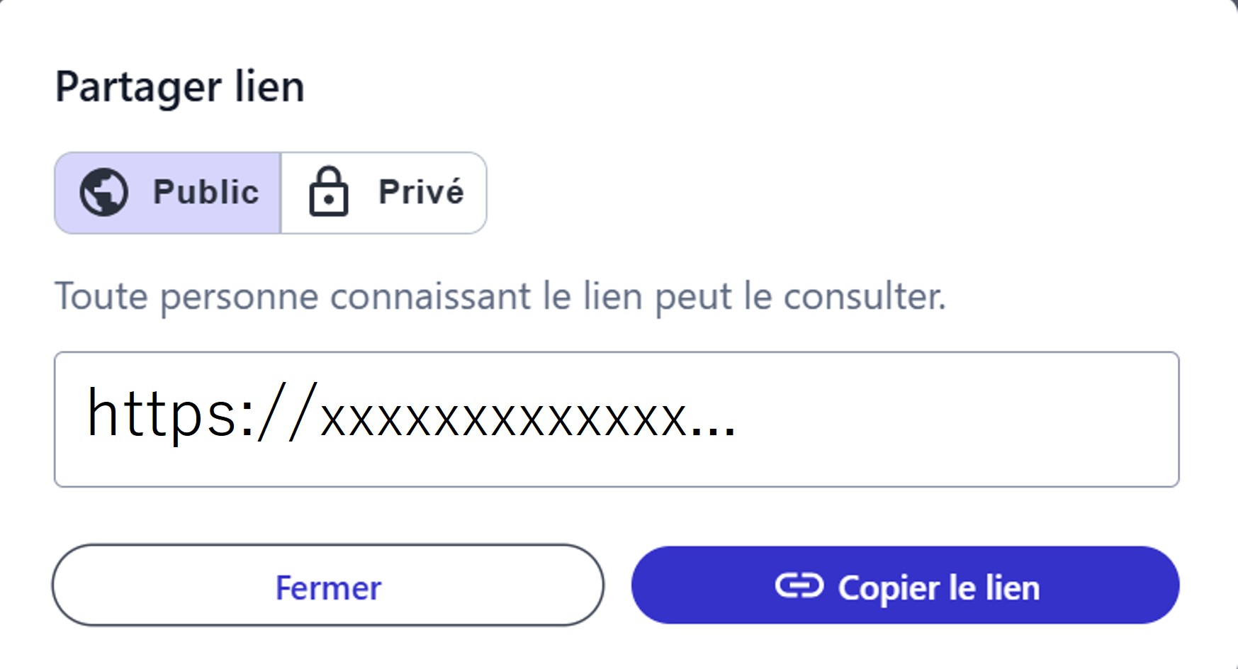 Si vous cliquez sur« Privé » dans cet écran, le lien sera défini comme privé.