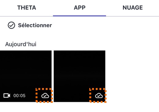La vignette des photos téléchargées vers le Nuage RICOH360 affiche une « icône de téléchargement » dans le coin inférieur droit.