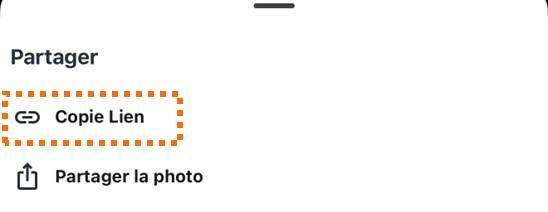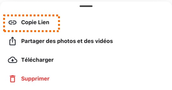 3. Appuyez sur Partager lien dans la liste affichée en bas de l'écran. Le lien (URL) sera copié dans le presse-papier, et vous pourrez le coller n'importe où (navigateur, e-mail, etc.).