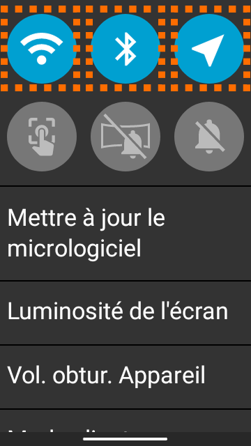 2. Faites glisser votre doigt vers le bas depuis le haut de l'écran de THETA X., y appuyez sur les icônes correspondant au réseau local sans fil, à la fonction Bluetooth® et aux informations de localisation pour les activer (couleur bleue).