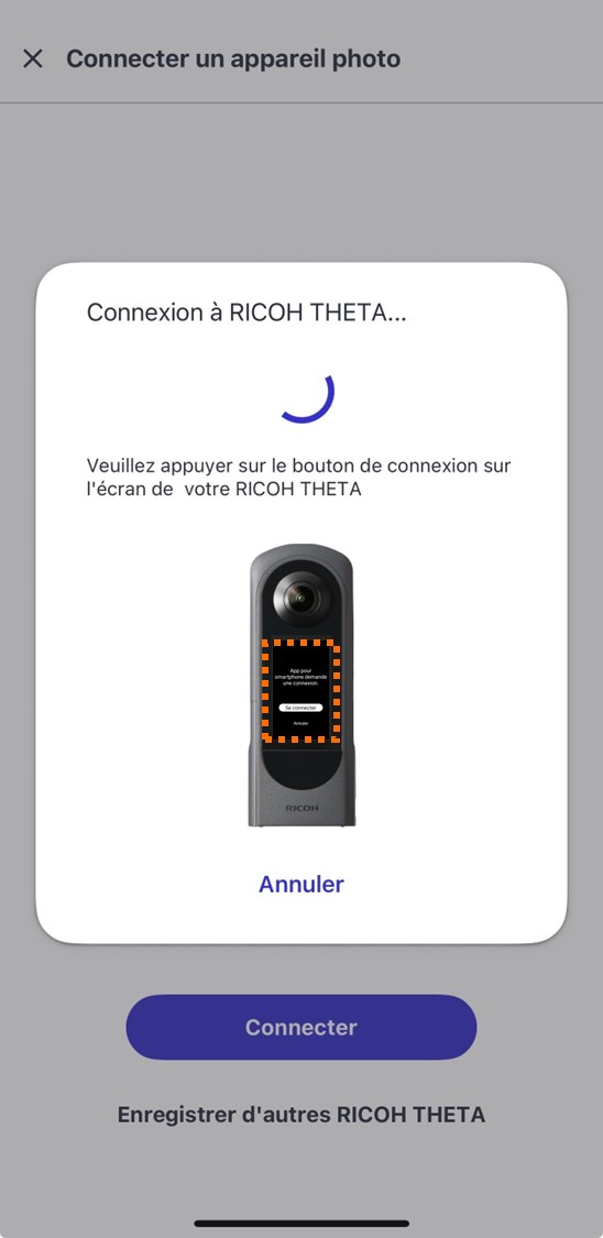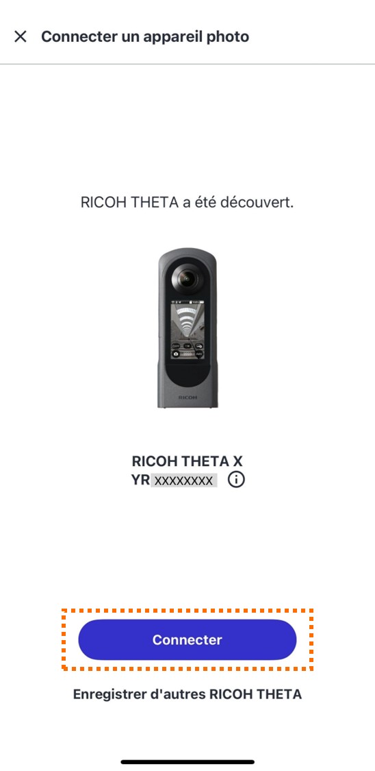 9. Si l'écran ci-dessous s'affiche, appuyez sur le bouton [Connection] affiché sur l'écran de l'appareil THETA X.